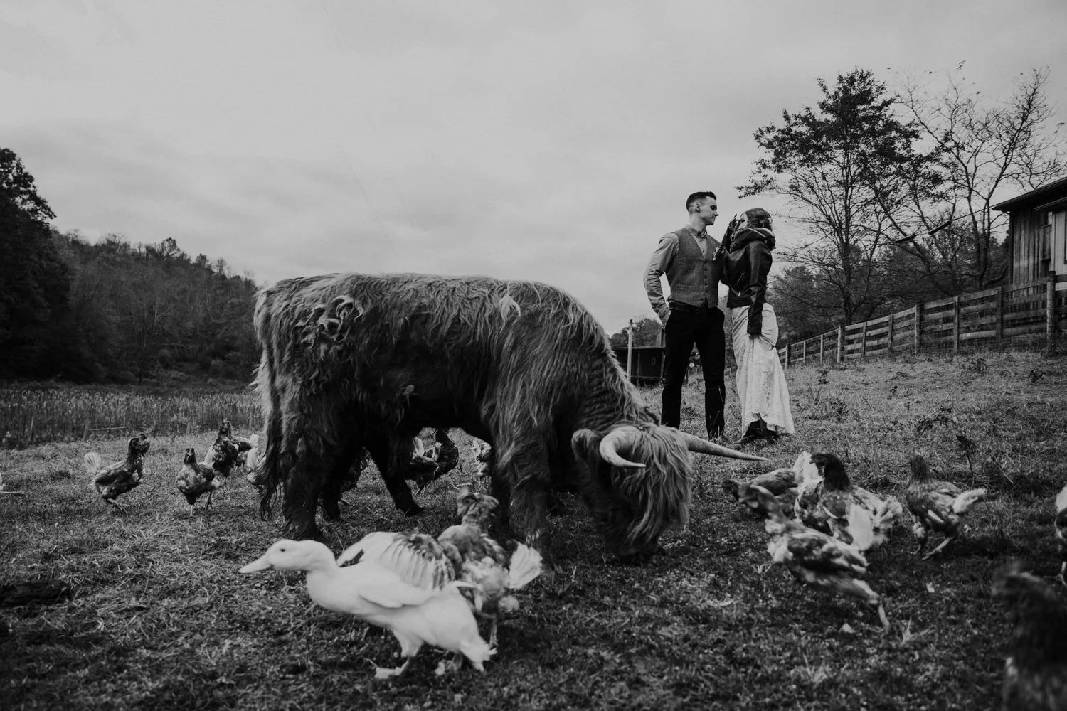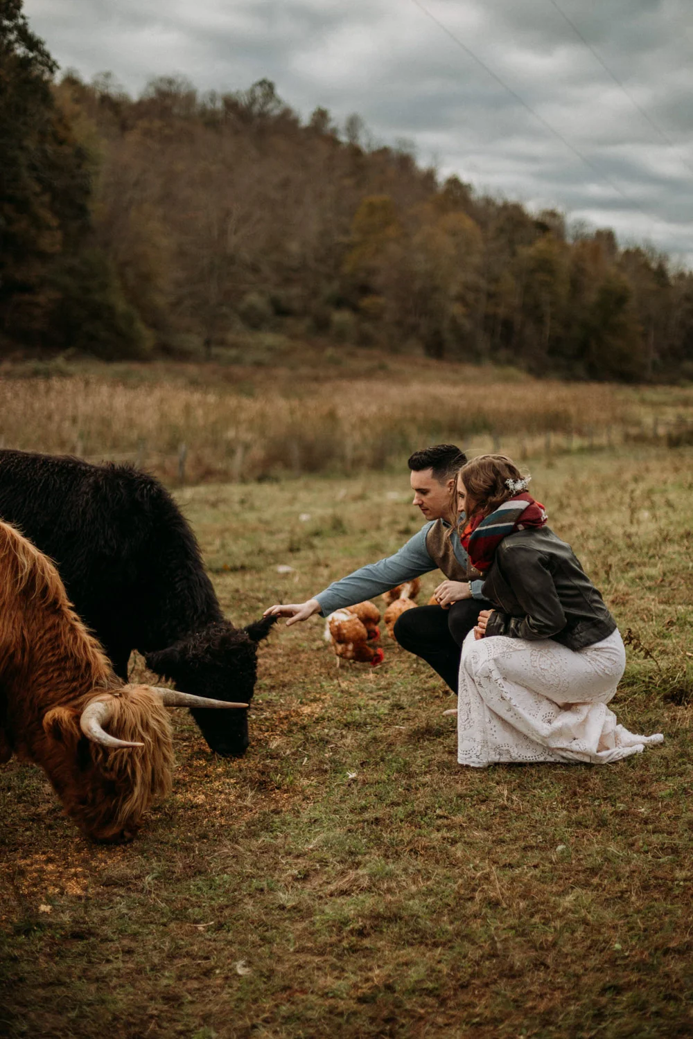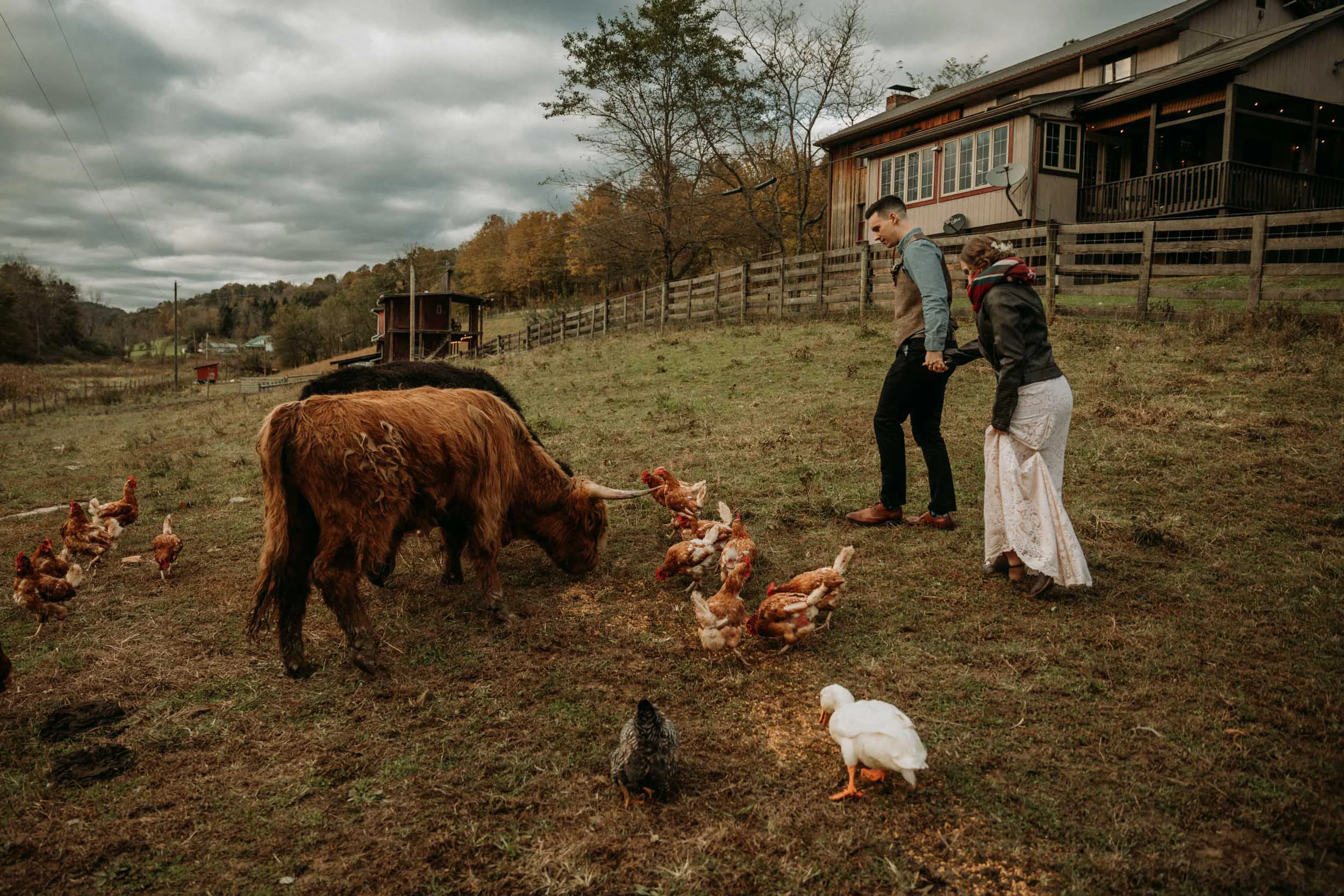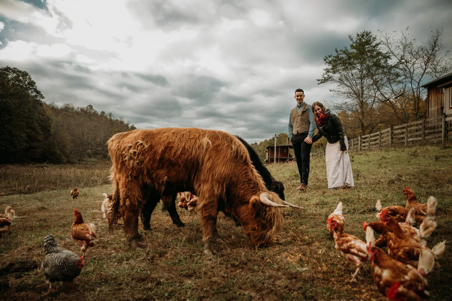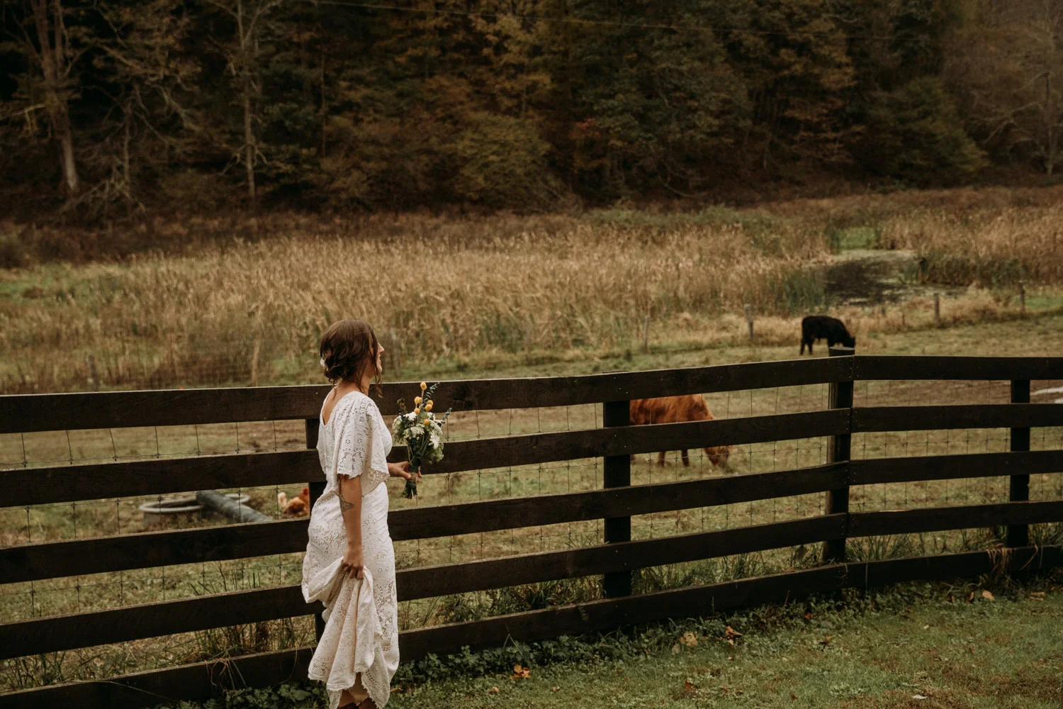 On a chilly day in late October, Brendan & Allison joined their lives together in a small 1800s-era cabin in Pennsylavania’s farm country. The fog hid the surrounding hills in a shroud that seemed to resonate with expectancy. The highlander cows made all of us wonder if we were really in Scotland or Ireland rather than Pennsylvania. Despite the overcast skies and chill in the breeze, emotions were light and cheery. The air still held a heavy feeling of awe. We knew that whatever the day held, we were in for an absolute treat. Surrounded only by their closest friends and family, the intimate ceremony allowed Brendan & Allison to focus on the magnitude of their vows. Tears flowed freely. Laughs were shared in one accord. The love & seriousness of the moment was felt deeply by all present. Following the ceremony, the sun peaked out just long enough for Brendan & Allison to watch the golden light set into the hills. The little bit of warmth the last of the sun provided was soaked in together as they got a moment away from everyone else. They danced, kissed, and shared the unfading feeling of bliss before returning back to their reception and enjoying a family style dinner under string lights. The night ended with a grand sparkler exit and lively line dancing enjoyed by all. The day was burned into everyone’s hearts and minds, the specialness of the entire day never to be forgotten.