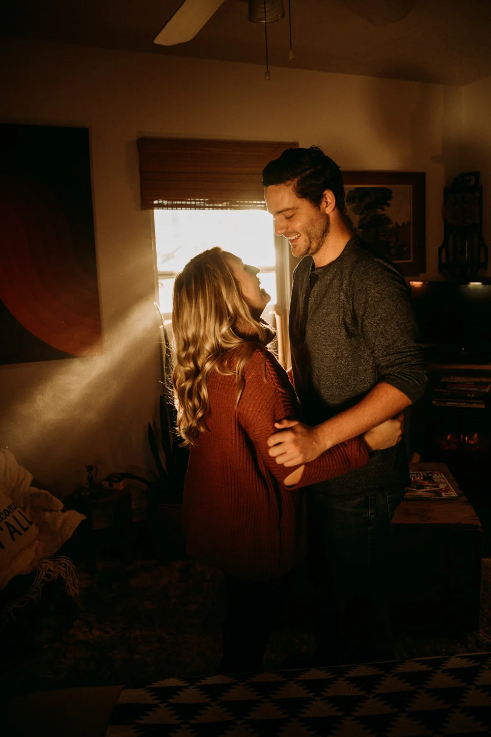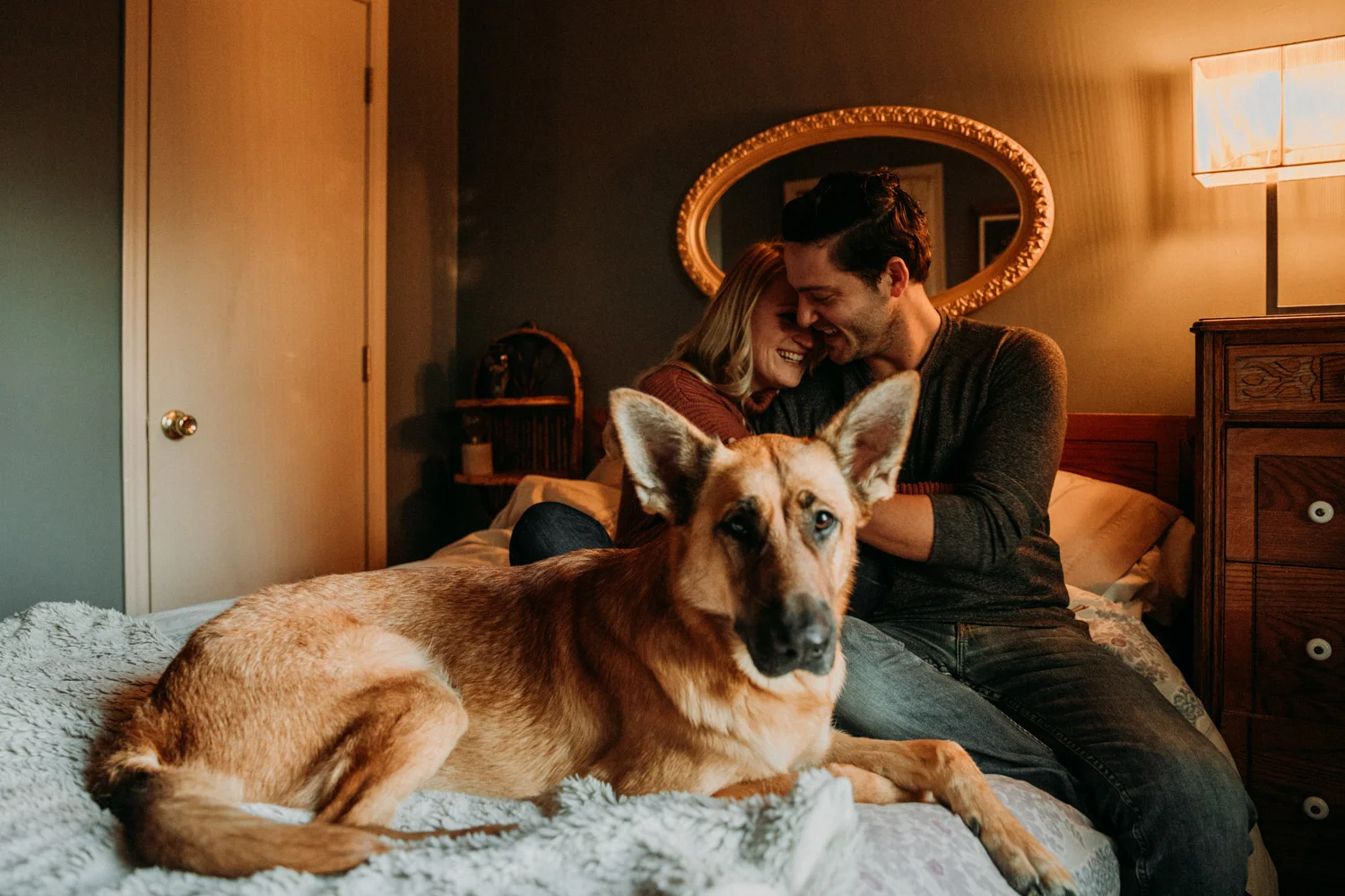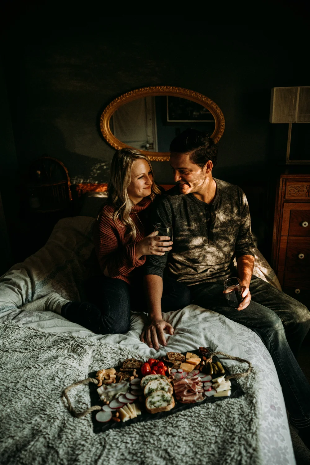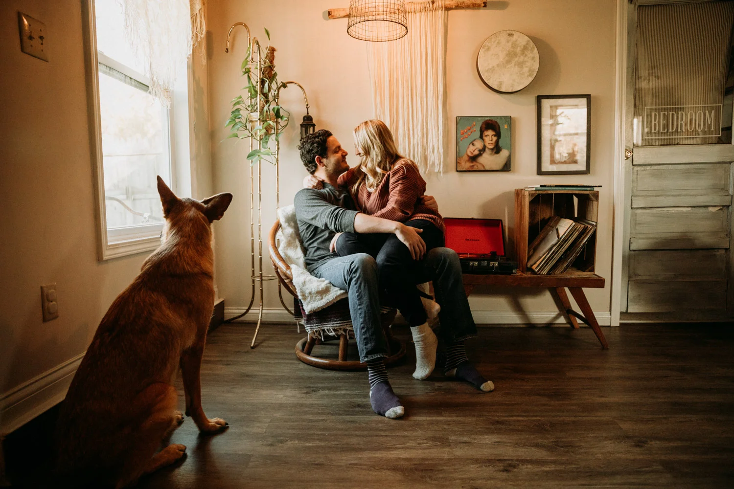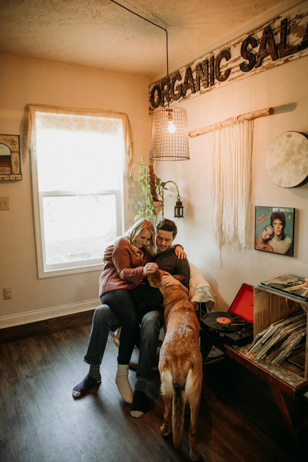 Katie & Evan met at a cookout and bonded over Katie’s pup, Java. At the time Evan was interested in getting a German Shepherd himself. He never had to though because he and Katie fell in love, and now they’re getting married. A normal evening for these two may very well include crafting a beautiful charcuterie together with Dean Martin playing in the background and Java giving them the best practiced puppy eye look. It was all recreated for this lifestyle engagement shoot. Real life records were played, coffee was brewed, charcuteries were crafted, and cuddles were enjoyed all while Katie & Evan reflected on the past, dreamed about their forever together, and savored the present. You would think it was straight out of a movie. But it was real.