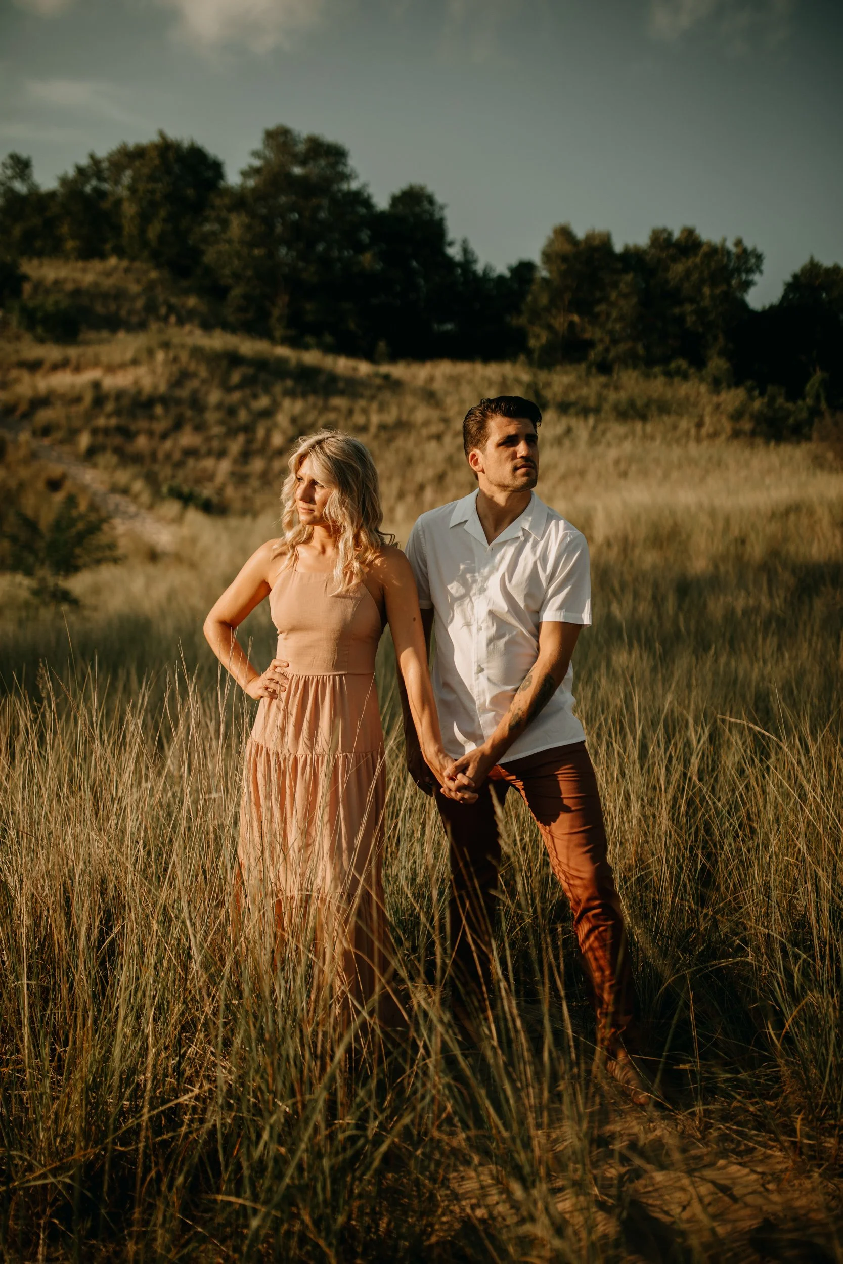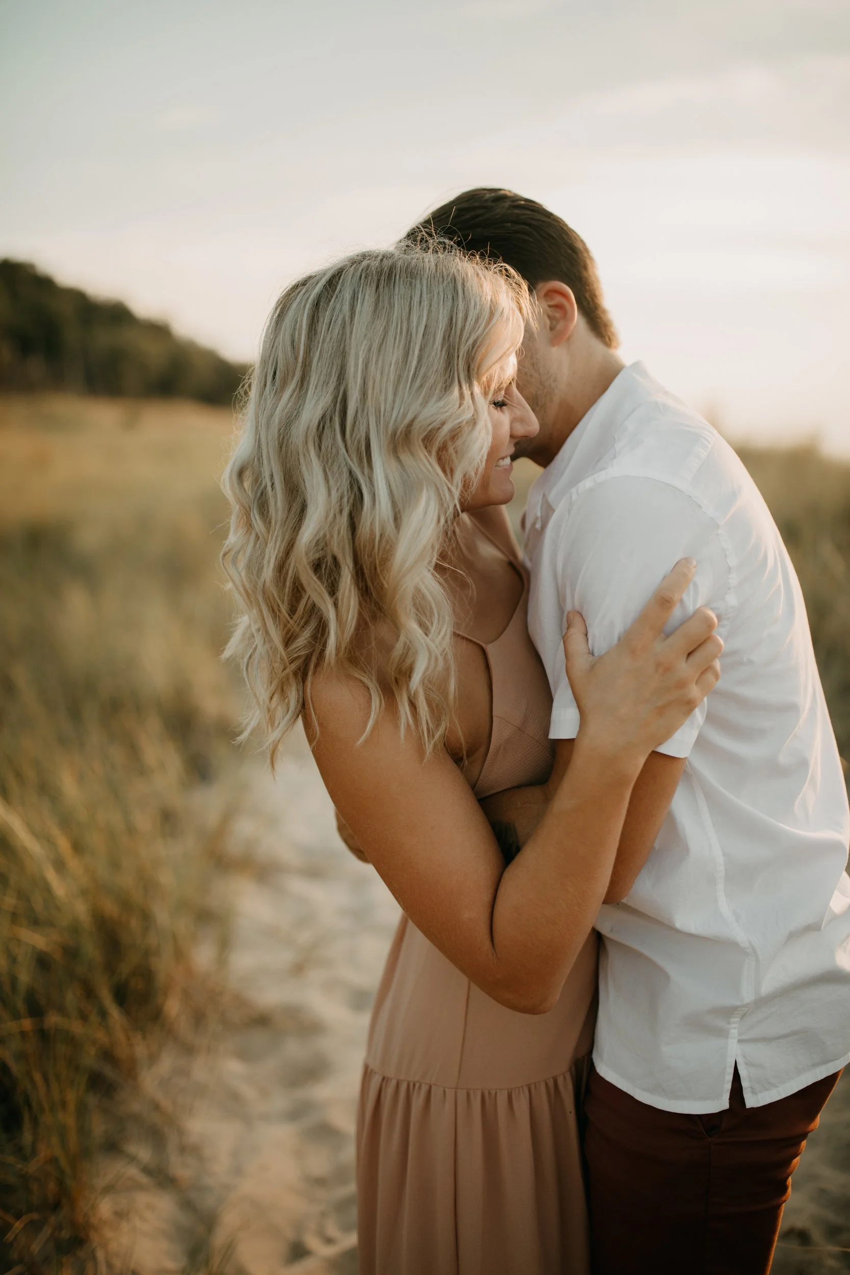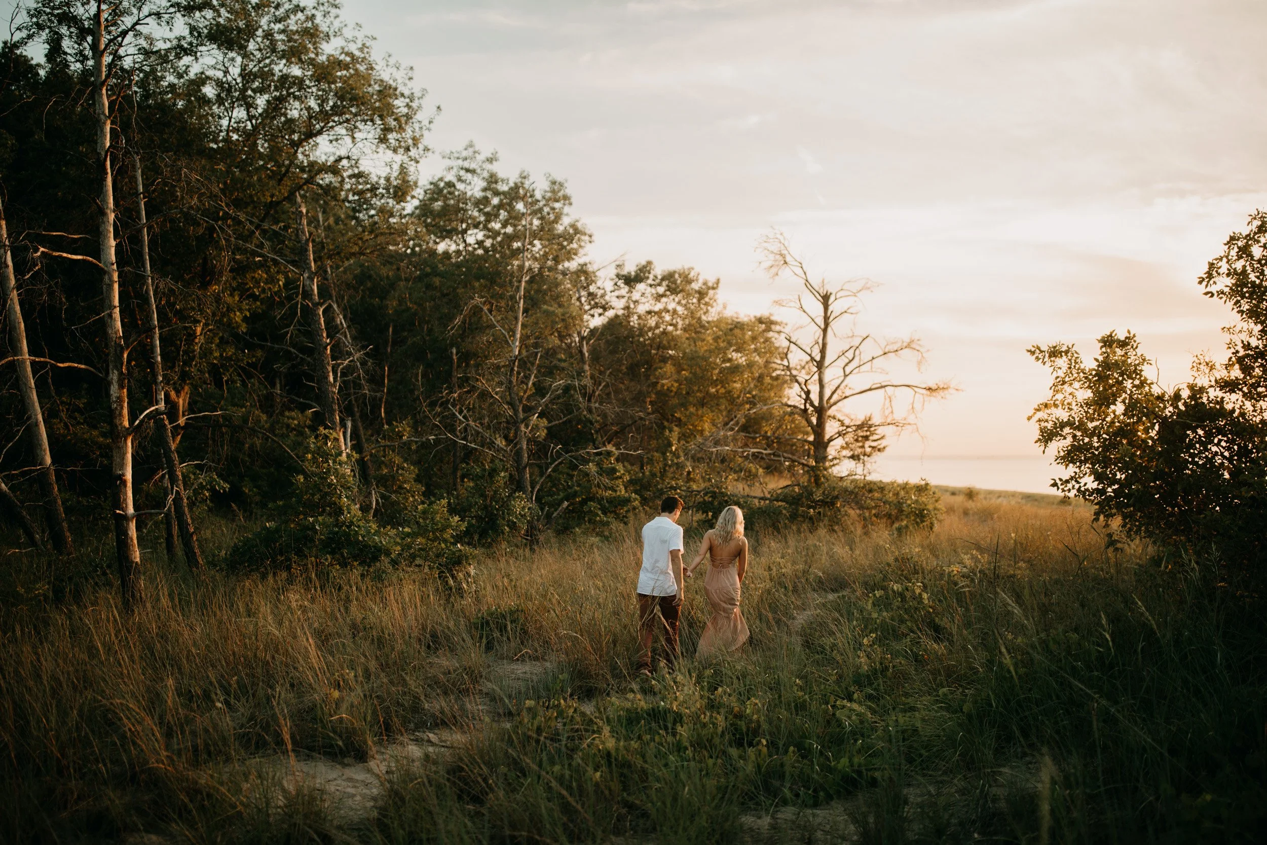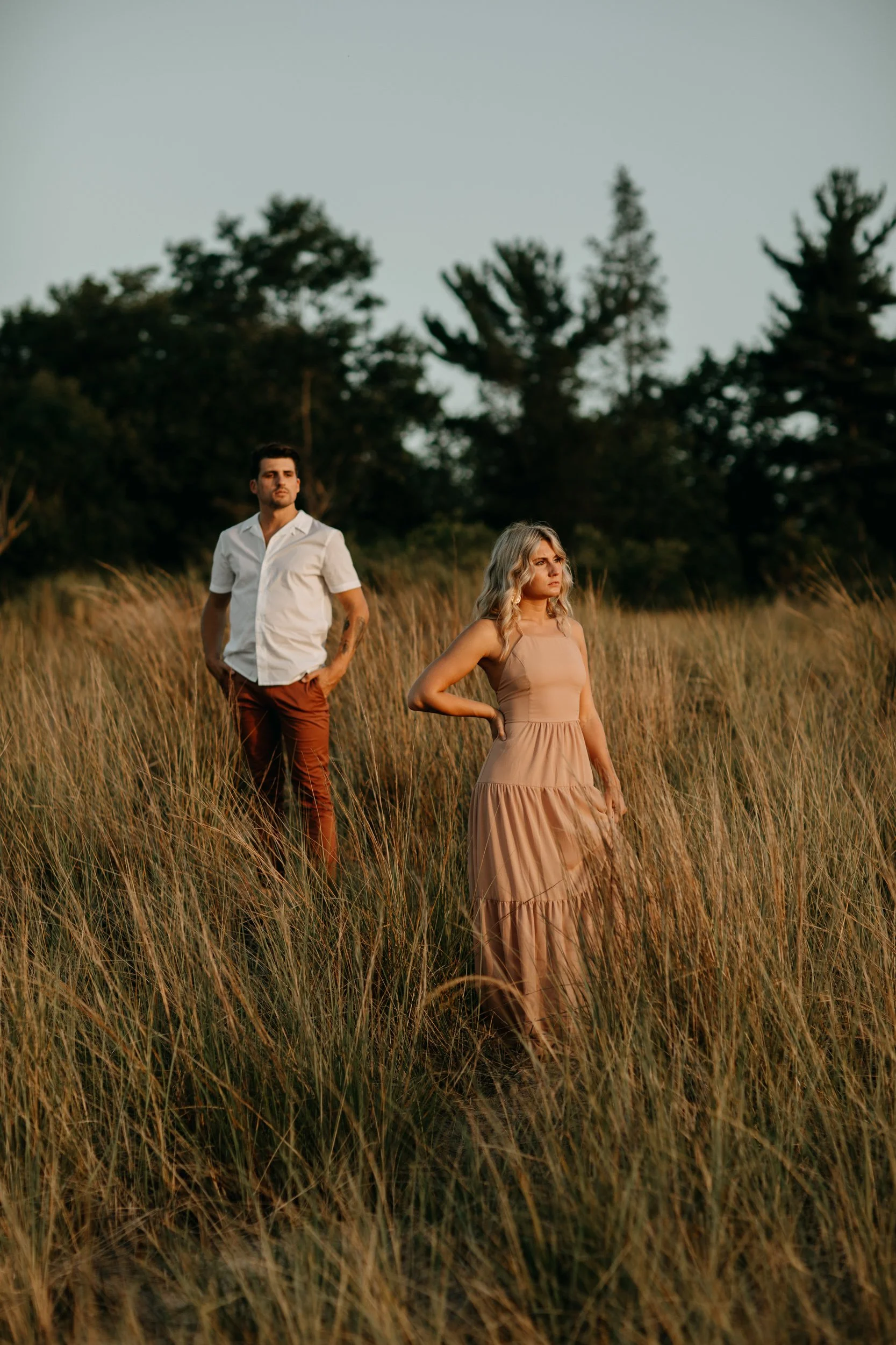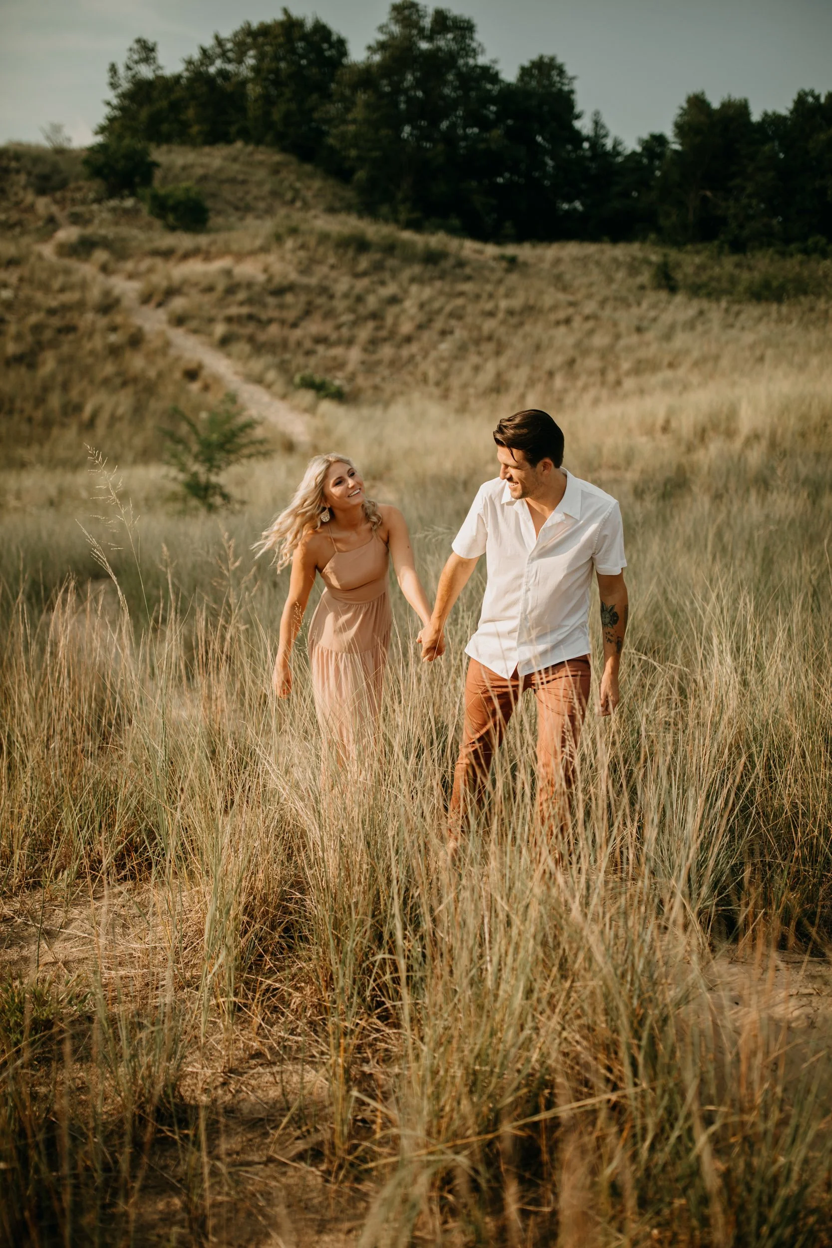The sun cast a golden hue on everything it touched that day. Cassidy & Brian’s love was on full display seeming to mimic the sunlight in its vastness. As we made our way closer to the lake, the gold color began to intensify all around us. The session wrapped up with Cassidy and Brian jumping into the lake as the sun set! The dunes provided the perfect backdrop and environment for the most FUN and romantic session.