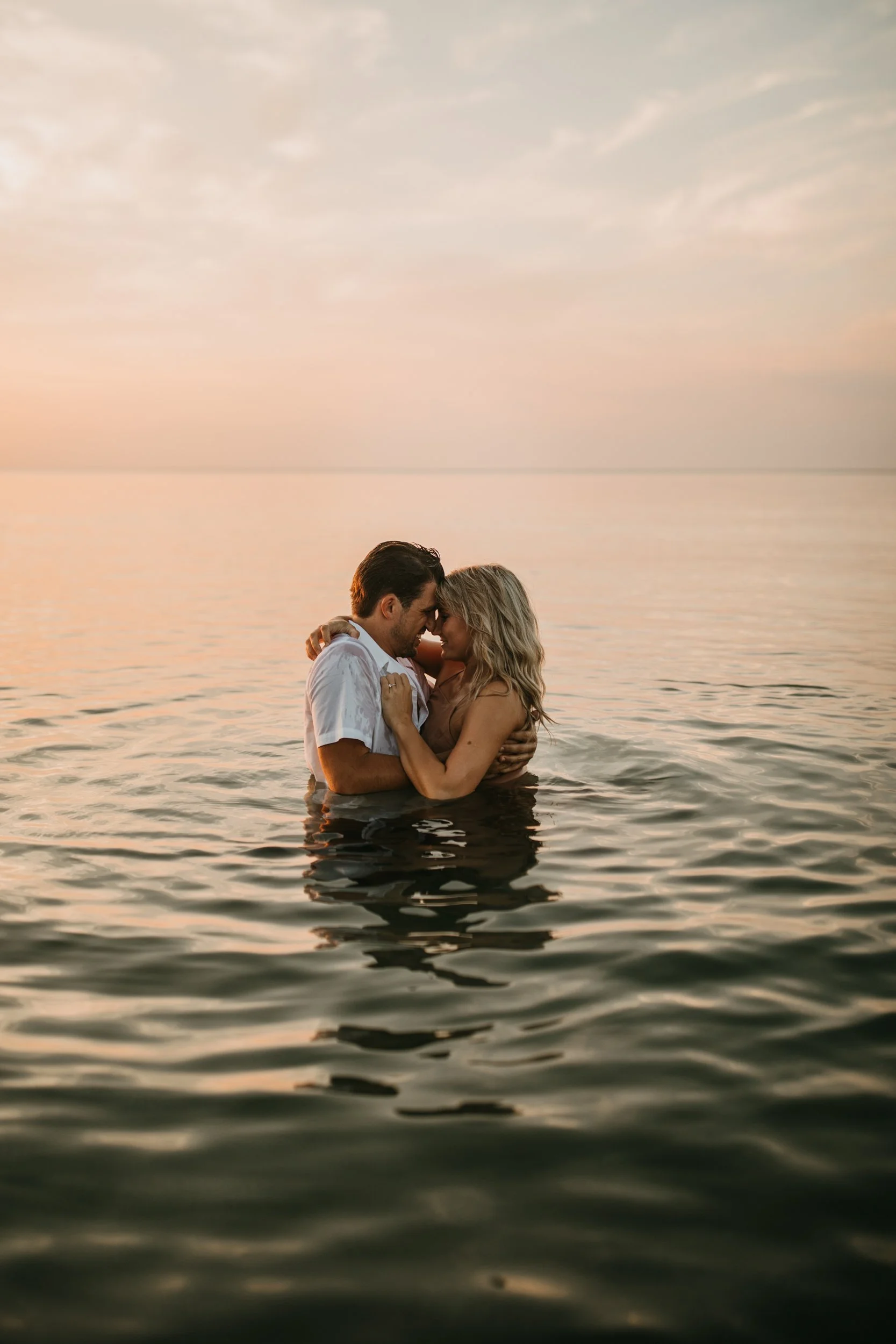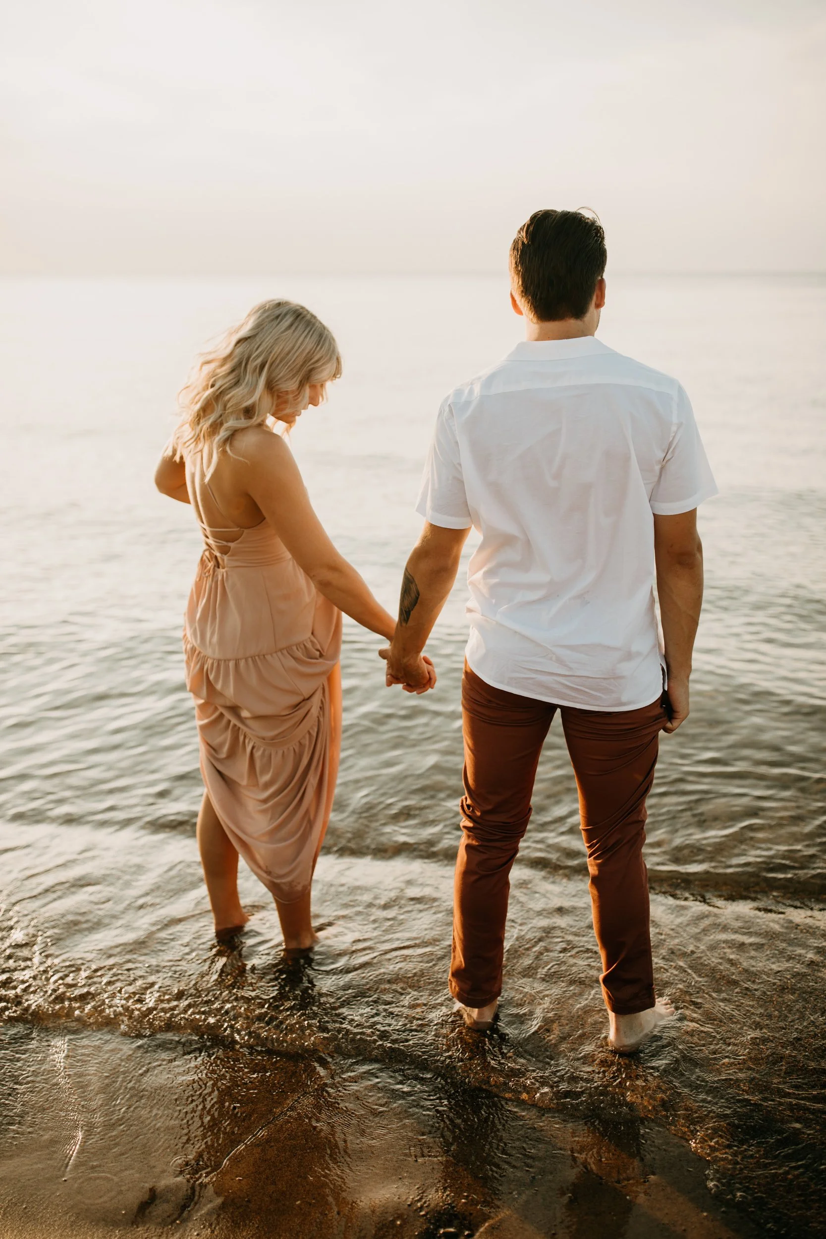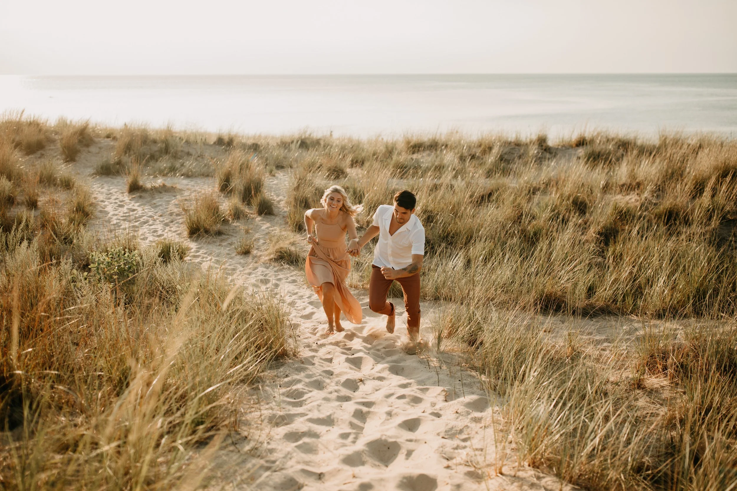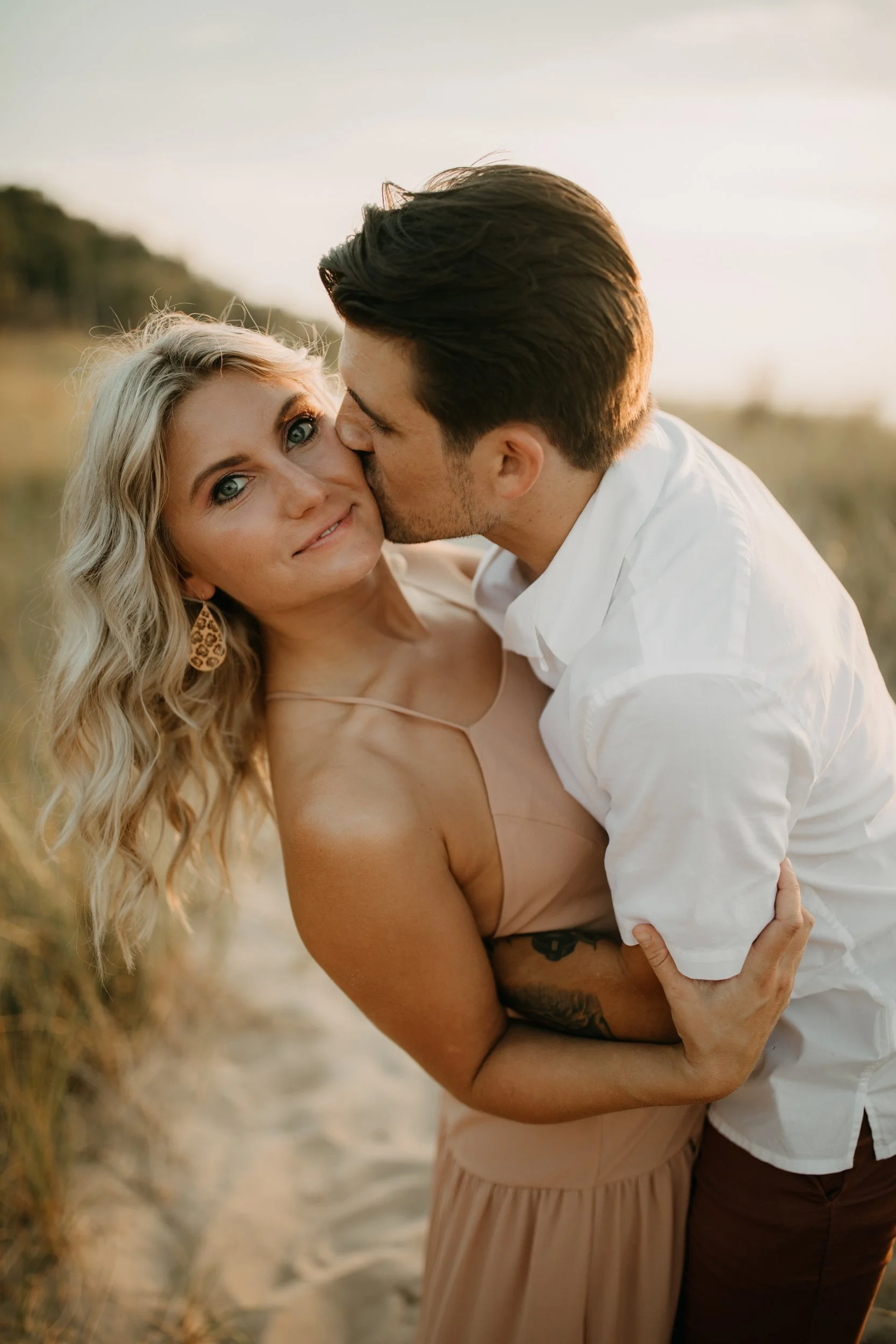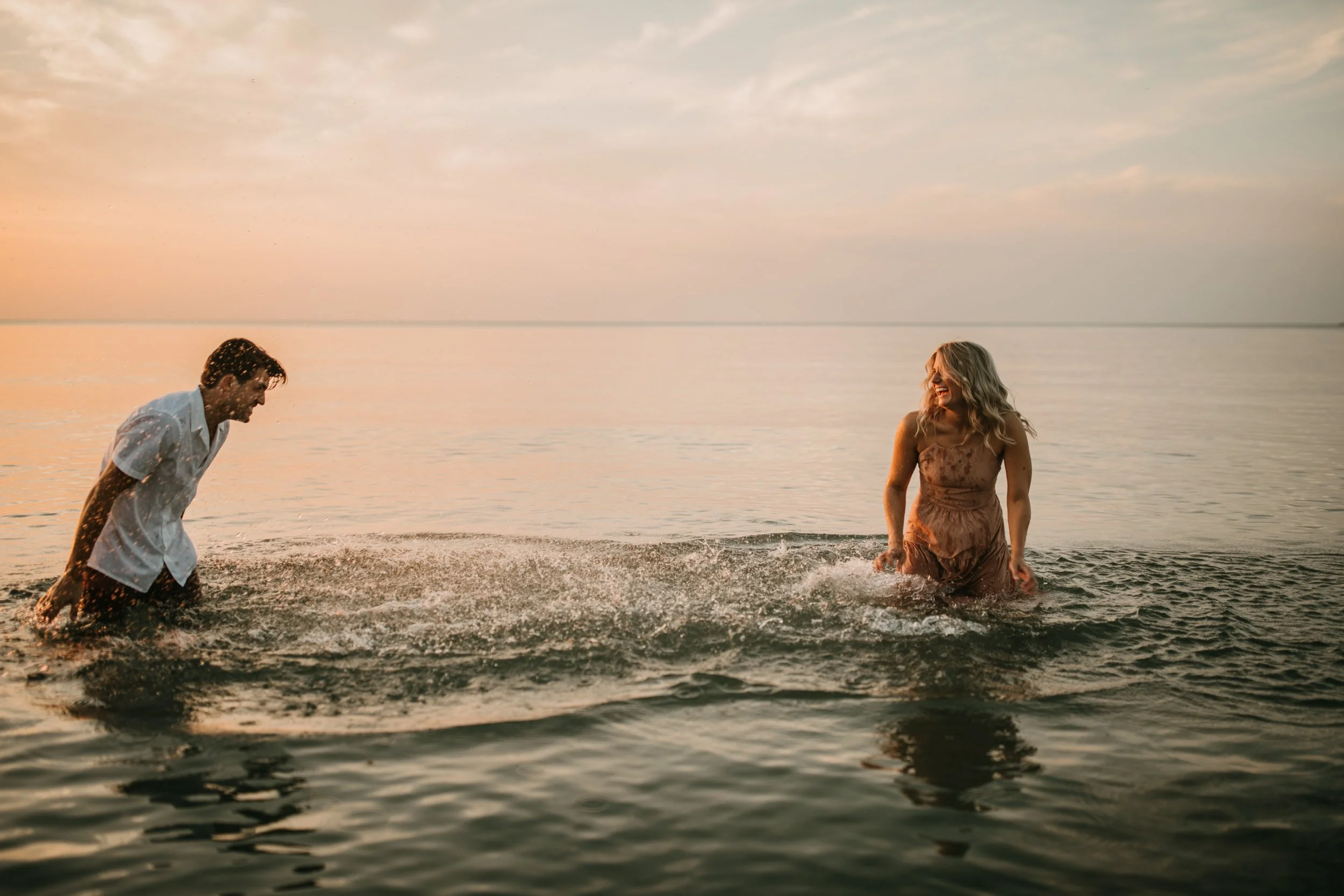 The sun cast a golden hue on everything it touched that day. Cassidy & Brian’s love was on full display seeming to mimic the sunlight in its vastness. As we made our way closer to the lake, the gold color began to intensify all around us. The session wrapped up with Cassidy and Brian jumping into the lake as the sun set! The dunes provided the perfect backdrop and environment for the most FUN and romantic session.
