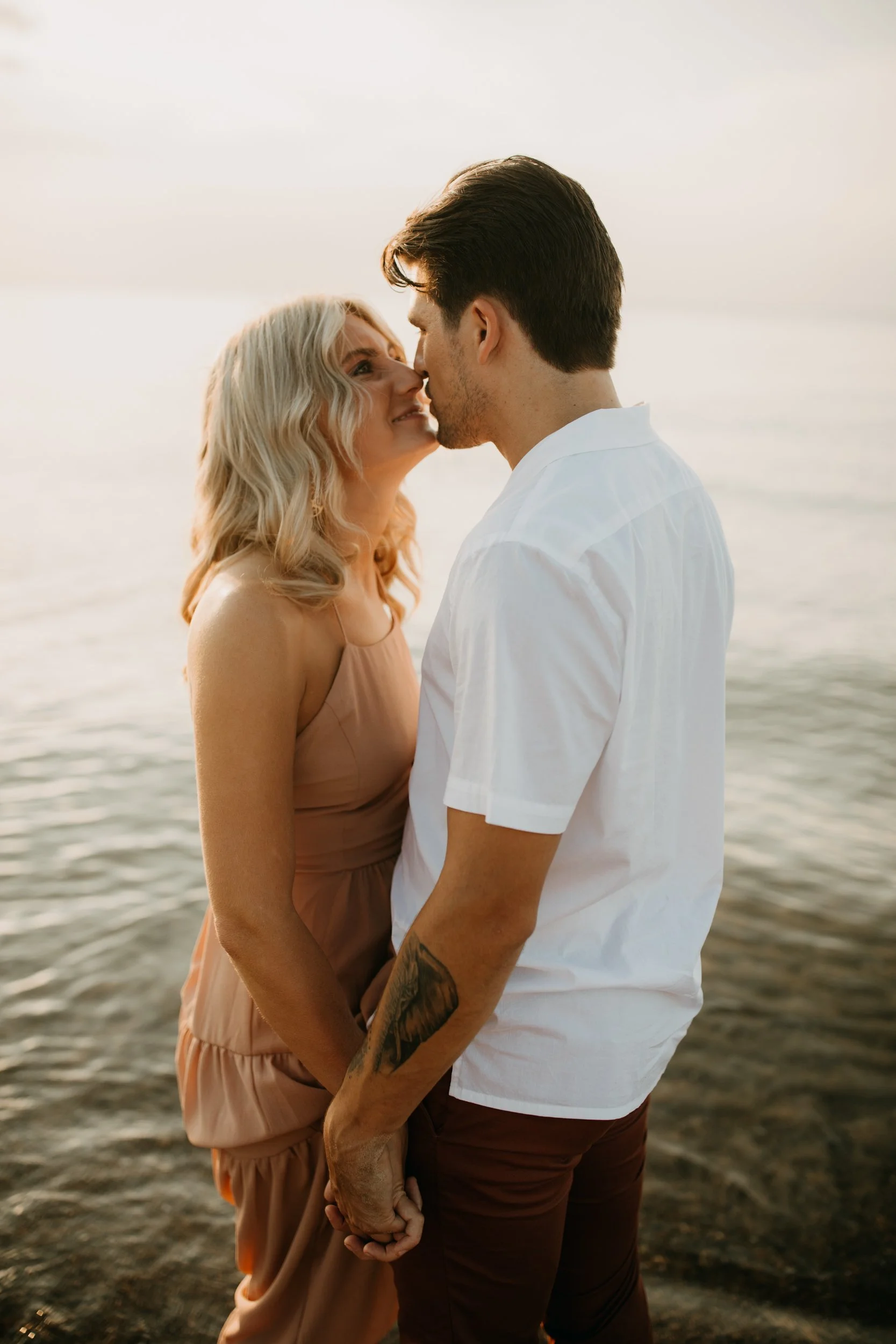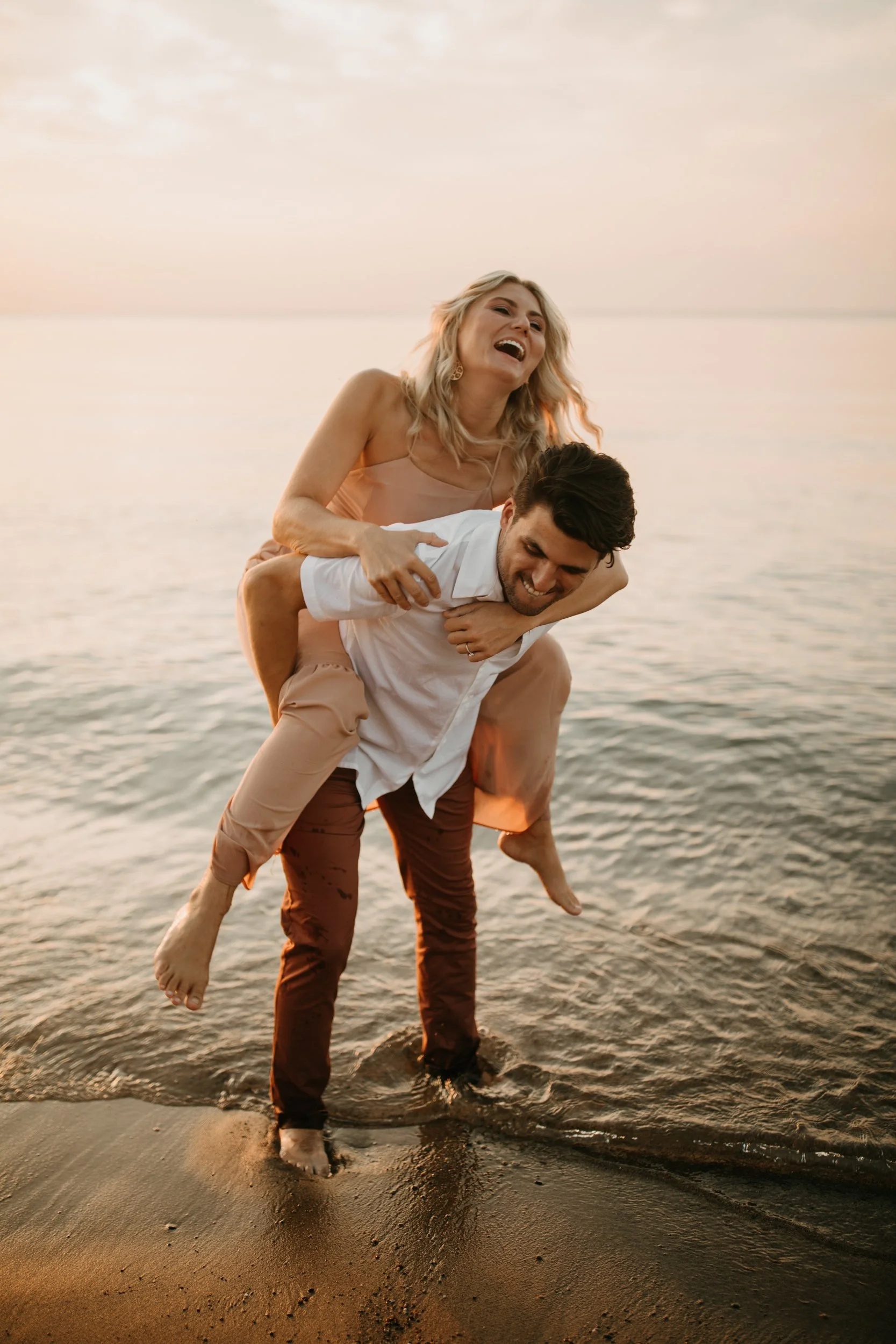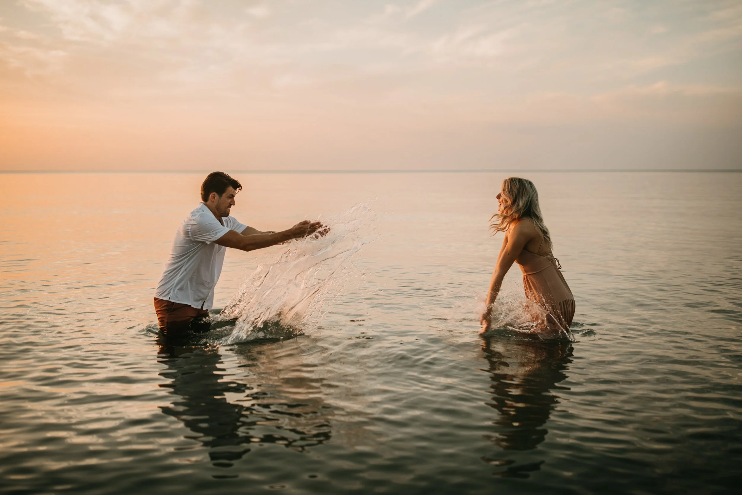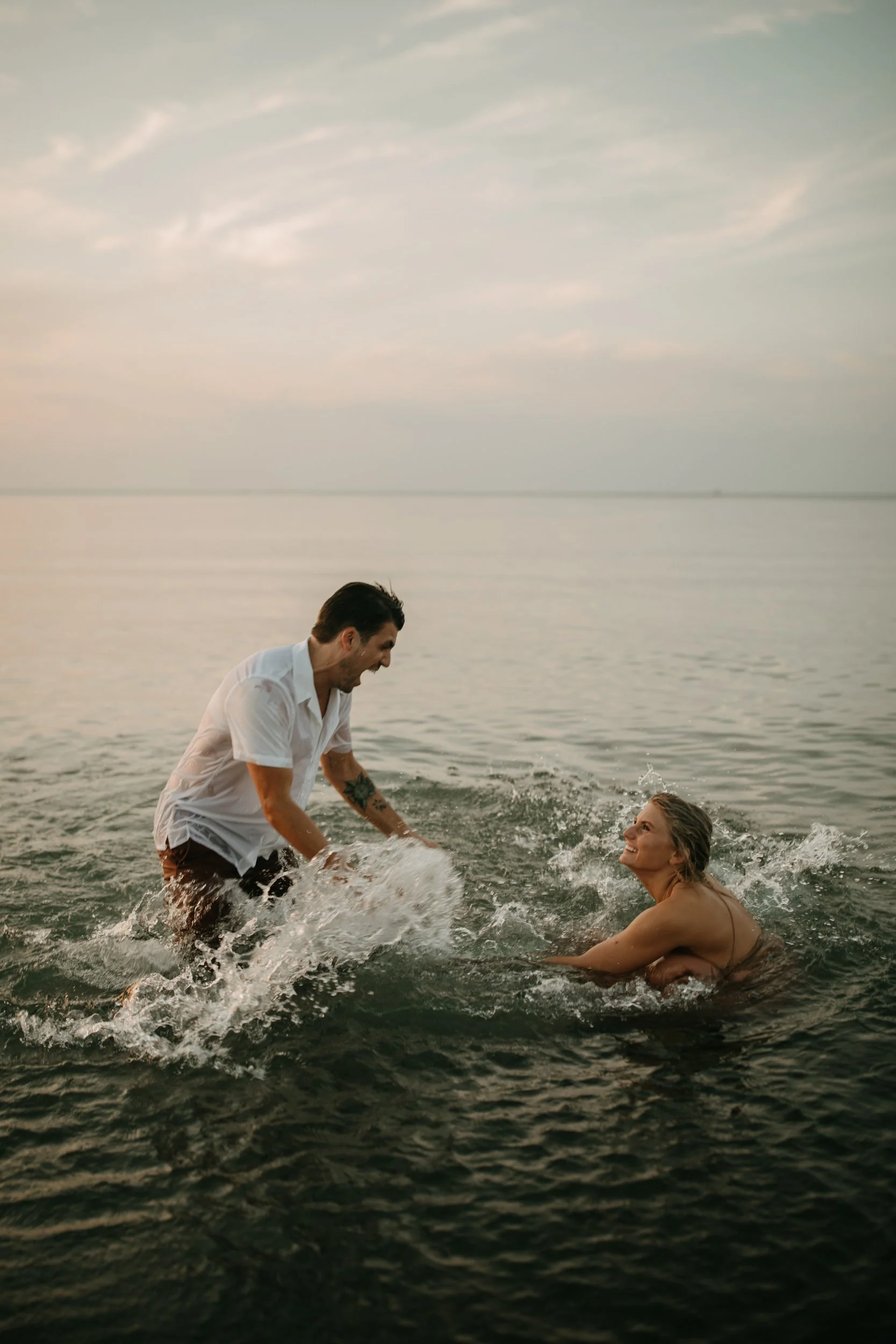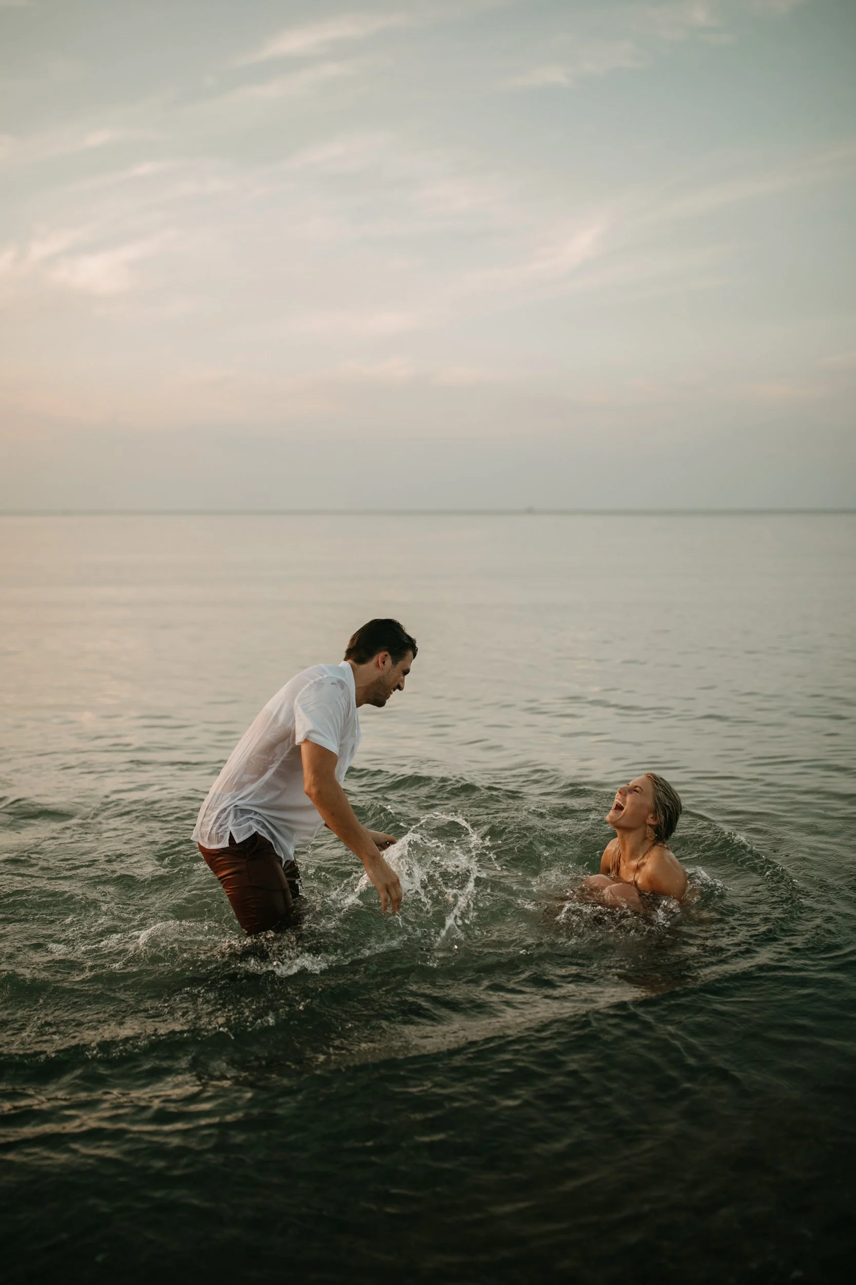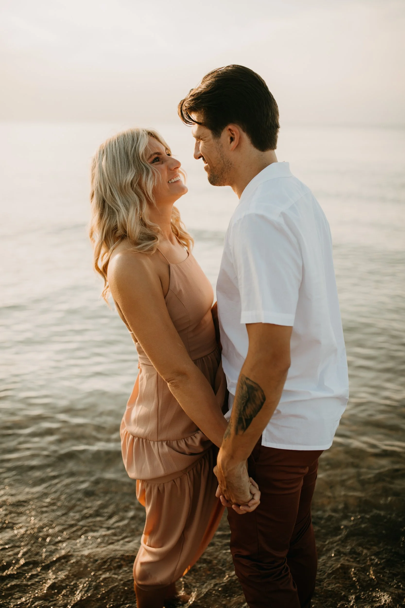 The sun cast a golden hue on everything it touched that day. Cassidy & Brian’s love was on full display seeming to mimic the sunlight in its vastness. As we made our way closer to the lake, the gold color began to intensify all around us. The session wrapped up with Cassidy and Brian jumping into the lake as the sun set! The dunes provided the perfect backdrop and environment for the most FUN and romantic session.