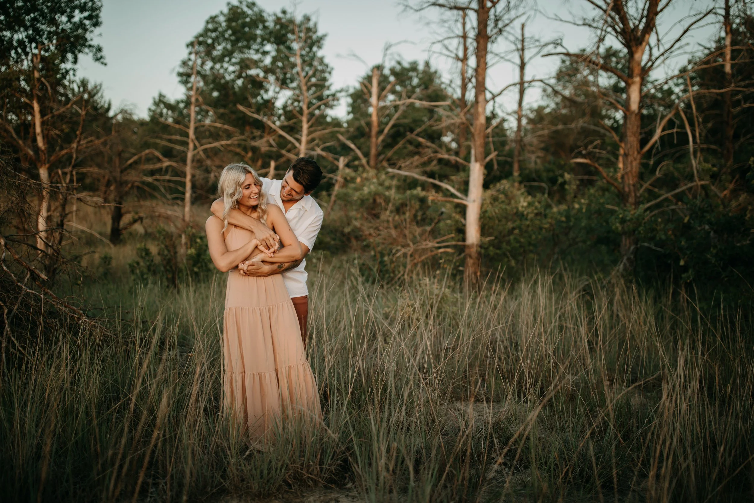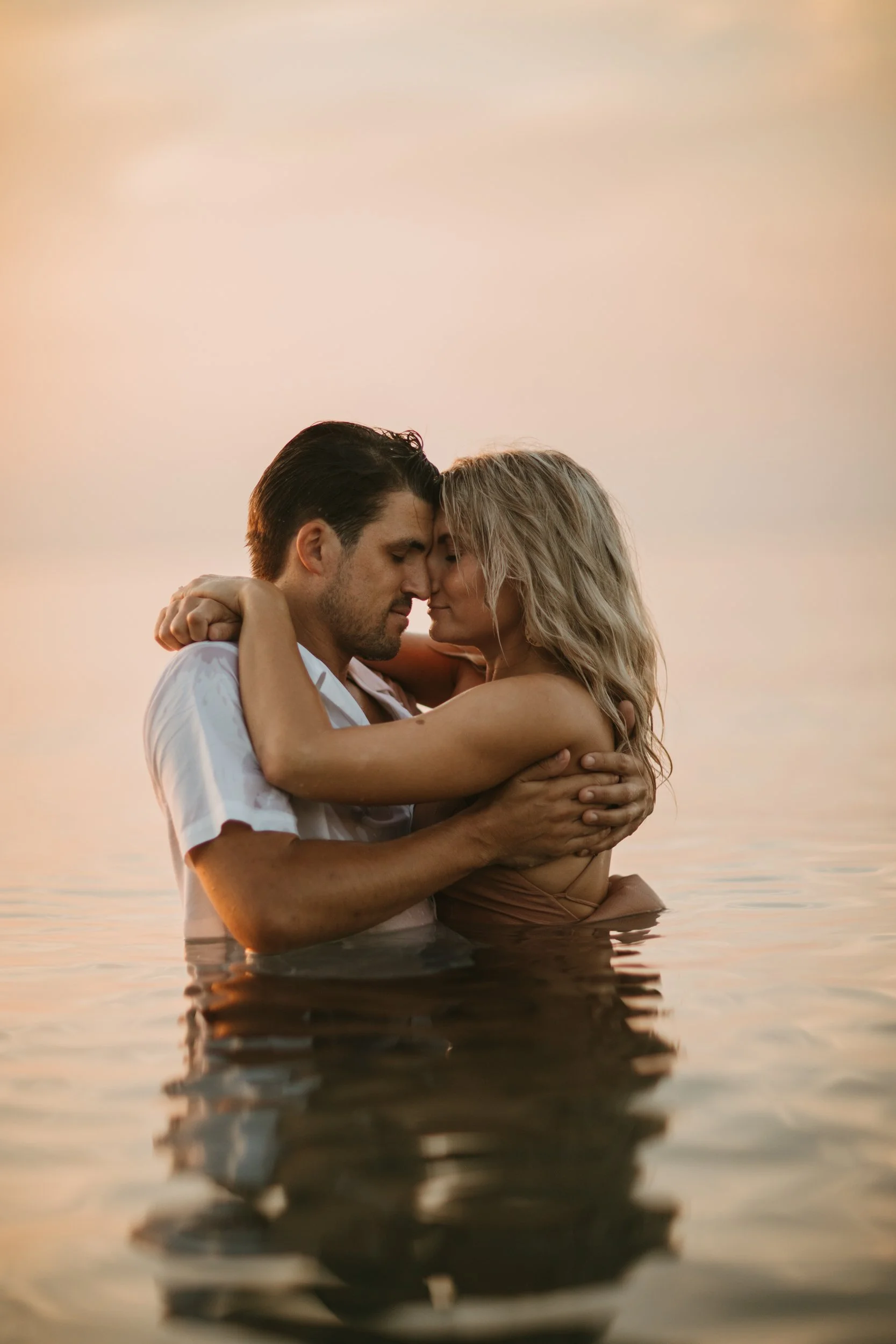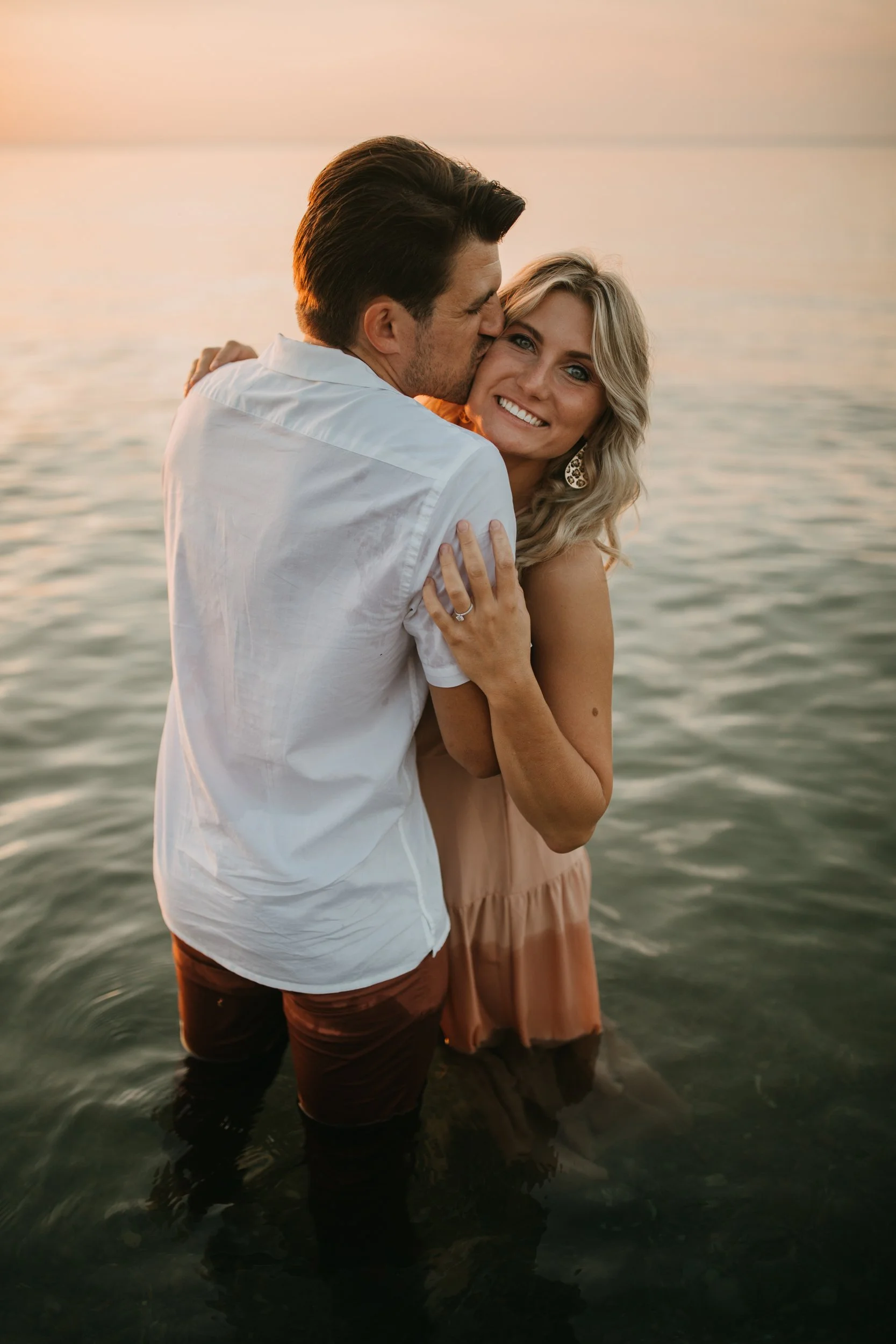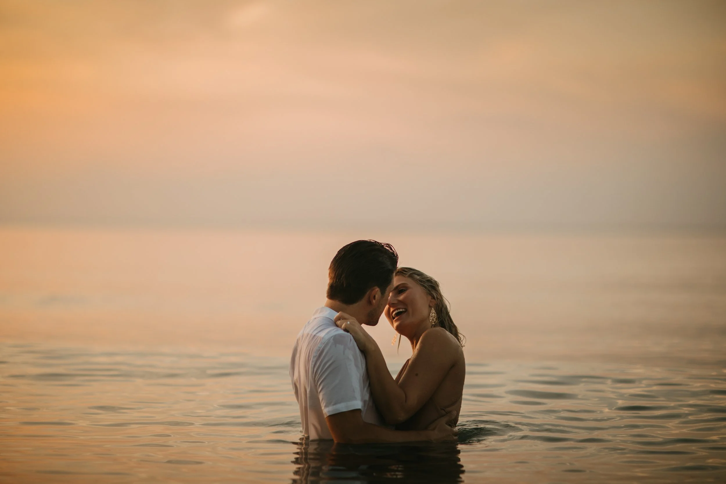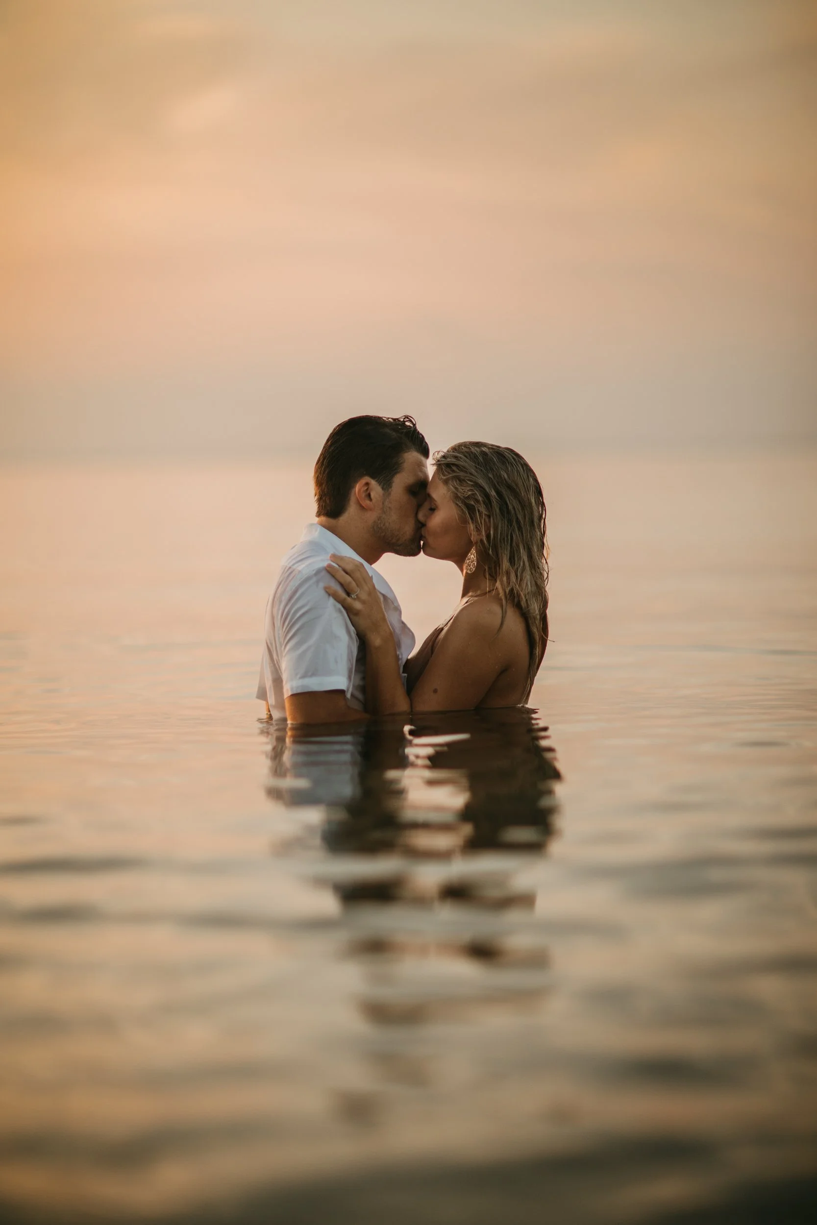 The sun cast a golden hue on everything it touched that day. Cassidy & Brian’s love was on full display seeming to mimic the sunlight in its vastness. As we made our way closer to the lake, the gold color began to intensify all around us. The session wrapped up with Cassidy and Brian jumping into the lake as the sun set! The dunes provided the perfect backdrop and environment for the most FUN and romantic session.